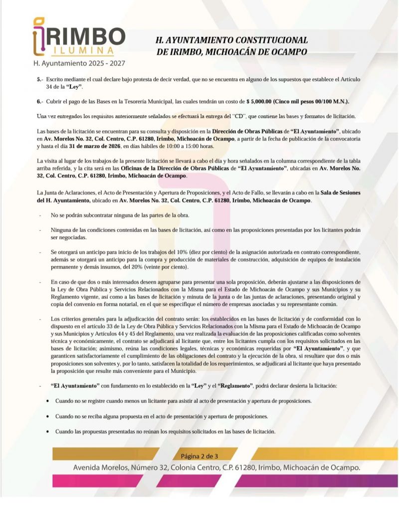 Requisitos para participar en la licitación 1.- Solicitud de inscripción, manifestando ser de nacionalidad mexicana y conocer la Ley de Obra Pública y Servicios Relacionados con la Misma para el Estado de Michoacán de Ocampo y sus Municipios, así como su Reglamento, citando el número y descripción de la licitación, así como su domicilio y correo electrónico para oír y recibir todo tipo de notificaciones relacionadas con la propia licitación; dicha solicitud deberá estar firmada por el Apoderado, Administrador o Representante Legal de la Empresa. 2.- Manifestación de integridad bajo protesta de decir verdad, de cuál es su número de contratista que tiene asignado en el Registro del Padrón de Contratistas del Gobierno del Estado de Michoacán de Ocampo, y que su información se encuentra completa y actualizada en el citado registro, así como los datos generales de la persona moral o física de que se trate. Siendo importante mencionar que, el domicilio señalado en dicho escrito deberá ser el mismo, al que se tenga registrado en el Padrón de Contratistas. 3.- Copia del Recibo de pago y del Registro actualizado del Padrón Estatal de Contratistas de Obra Pública, con la siguiente especialidad: 160.- Infraestructura Urbana y Servicios Públicos. 4.- Constancia de NO inhabilitación para participar en el procedimiento de contratación vigente, emitida por la Secretaría de Contraloría del Gobierno del Estado. 5.- Escrito mediante el cual declare bajo protesta de decir verdad, que no se encuentra en alguno de los supuestos que establece el Artículo 34 de la “Ley”. 6.- Cubrir el pago de las Bases en la Tesorería Municipal, las cuales tendrán un costo de $ 5,000.00 (Cinco mil pesos 00/100 M.N.). Una vez entregados los requisitos anteriormente señalados se efectuará la entrega del “CD”, que contiene las bases y formatos de licitación. Las bases de la licitación se encuentran para su consulta y disposición en la Dirección de Obras Públicas de “El Ayuntamiento”, ubicado en Av. Morelos No. 32, Col. Centro, C.P. 61280, Irimbo, Michoacán de Ocampo, a partir de la fecha de publicación de la convocatoria y hasta el día 31 de marzo de 2026, en días hábiles de 10:00 a 15:00 horas. La visita al lugar de los trabajos de la presente licitación se llevará a cabo el día y hora señalados en la columna correspondiente de la tabla arriba referida, y la cita será en las Oficinas de la Dirección de Obras Públicas de “El Ayuntamiento”, ubicadas en Av. Morelos No. 32, Col. Centro, C.P. 61280, Irimbo, Michoacán de Ocampo. La Junta de Aclaraciones, el Acto de Presentación y Apertura de Proposiciones, y el Acto de Fallo, se llevarán a cabo en la Sala de Sesiones del H. Ayuntamiento, ubicado en Av. Morelos No. 32, Col. Centro, C.P. 61280, Irimbo, Michoacán de Ocampo. - No se podrán subcontratar ninguna de las partes de la obra. - Ninguna de las condiciones contenidas en las bases de licitación, así como en las proposiciones presentadas por los licitantes podrán ser negociadas. - Se otorgará un anticipo para inicio de los trabajos del 10% (diez por ciento) de la asignación autorizada en contrato correspondiente, además se otorgará un anticipo para la compra y producción de materiales de construcción, adquisición de equipos de instalación permanente y demás insumos, del 20% (veinte por ciento). - En caso de que dos o más interesados deseen agruparse para presentar una sola proposición, deberán ajustarse a las disposiciones de la Ley de Obra Pública y Servicios Relacionados con la Misma para el Estado de Michoacán de Ocampo y sus Municipios y su Reglamento vigente, así como a las bases de licitación y minuta de la junta o de las juntas de aclaraciones, presentando original y copia del convenio en forma notarial, en el que se especifique el número de empresas asociadas y su representante común. - Los criterios generales para la adjudicación del contrato serán: los establecidos en las bases de licitación y de conformidad con lo dispuesto en el artículo 33 de la Ley de Obra Pública y Servicios Relacionados con la Misma para el Estado de Michoacán de Ocampo y sus Municipios y Artículos 44 y 45 del Reglamento, una vez realizada la evaluación de las proposiciones calificadas como solventes técnica y económicamente, el contrato se adjudicará al licitante que, entre los licitantes cumpla con los requisitos solicitados en las bases de licitación; asimismo, reúna las condiciones legales, técnicas y económicas requeridas por “El Ayuntamiento”, y que garanticen satisfactoriamente el cumplimiento de las obligaciones del contrato y la ejecución de la obra, si resultare que dos o más proposiciones son solventes y, por lo tanto, satisfacen la totalidad de los requerimientos, se adjudicará al licitante que haya presentado la proposición que resulte más conveniente para el Municipio. - “El Ayuntamiento” con fundamento en lo establecido en la “Ley” y el “Reglamento”, podrá declarar desierta la licitación: Cuando no se registre cuando menos un licitante para asistir al acto de presentación y apertura de proposiciones. Cuando no se reciba alguna propuesta en el acto de presentación y apertura de proposiciones. Cuando las propuestas presentadas no reúnan los requisitos solicitados en las bases de licitación. Cuando los precios unitarios propuestos, no fueran aceptables. Si después de efectuada la evaluación, no fuere posible adjudicar el contrato a ningún licitante, por causas totalmente justificadas. - “El Ayuntamiento” con fundamento en lo establecido en la “Ley” y el “Reglamento”, podrá cancelar una licitación: Por caso fortuito o fuerza mayor. De igual manera, podrá cancelar cuando existan circunstancias, debidamente justificadas, que provoquen la extinción de la necesidad de contratar estos trabajos y que de continuarse con el procedimiento de contratación se pudiera ocasionar un daño o perjuici