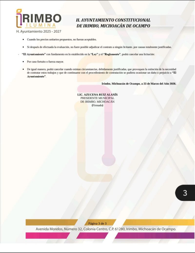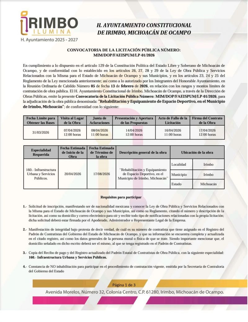 Requisitos para participar en la licitación 1.- Solicitud de inscripción, manifestando ser de nacionalidad mexicana y conocer la Ley de Obra Pública y Servicios Relacionados con la Misma para el Estado de Michoacán de Ocampo y sus Municipios, así como su Reglamento, citando el número y descripción de la licitación, así como su domicilio y correo electrónico para oír y recibir todo tipo de notificaciones relacionadas con la propia licitación; dicha solicitud deberá estar firmada por el Apoderado, Administrador o Representante Legal de la Empresa. 2.- Manifestación de integridad bajo protesta de decir verdad, de cuál es su número de contratista que tiene asignado en el Registro del Padrón de Contratistas del Gobierno del Estado de Michoacán de Ocampo, y que su información se encuentra completa y actualizada en el citado registro, así como los datos generales de la persona moral o física de que se trate. Siendo importante mencionar que, el domicilio señalado en dicho escrito deberá ser el mismo, al que se tenga registrado en el Padrón de Contratistas. 3.- Copia del Recibo de pago y del Registro actualizado del Padrón Estatal de Contratistas de Obra Pública, con la siguiente especialidad: 160.- Infraestructura Urbana y Servicios Públicos. 4.- Constancia de NO inhabilitación para participar en el procedimiento de contratación vigente, emitida por la Secretaría de Contraloría del Gobierno del Estado. 5.- Escrito mediante el cual declare bajo protesta de decir verdad, que no se encuentra en alguno de los supuestos que establece el Artículo 34 de la “Ley”. 6.- Cubrir el pago de las Bases en la Tesorería Municipal, las cuales tendrán un costo de $ 5,000.00 (Cinco mil pesos 00/100 M.N.). Una vez entregados los requisitos anteriormente señalados se efectuará la entrega del “CD”, que contiene las bases y formatos de licitación. Las bases de la licitación se encuentran para su consulta y disposición en la Dirección de Obras Públicas de “El Ayuntamiento”, ubicado en Av. Morelos No. 32, Col. Centro, C.P. 61280, Irimbo, Michoacán de Ocampo, a partir de la fecha de publicación de la convocatoria y hasta el día 31 de marzo de 2026, en días hábiles de 10:00 a 15:00 horas. La visita al lugar de los trabajos de la presente licitación se llevará a cabo el día y hora señalados en la columna correspondiente de la tabla arriba referida, y la cita será en las Oficinas de la Dirección de Obras Públicas de “El Ayuntamiento”, ubicadas en Av. Morelos No. 32, Col. Centro, C.P. 61280, Irimbo, Michoacán de Ocampo. La Junta de Aclaraciones, el Acto de Presentación y Apertura de Proposiciones, y el Acto de Fallo, se llevarán a cabo en la Sala de Sesiones del H. Ayuntamiento, ubicado en Av. Morelos No. 32, Col. Centro, C.P. 61280, Irimbo, Michoacán de Ocampo. - No se podrán subcontratar ninguna de las partes de la obra. - Ninguna de las condiciones contenidas en las bases de licitación, así como en las proposiciones presentadas por los licitantes podrán ser negociadas. - Se otorgará un anticipo para inicio de los trabajos del 10% (diez por ciento) de la asignación autorizada en contrato correspondiente, además se otorgará un anticipo para la compra y producción de materiales de construcción, adquisición de equipos de instalación permanente y demás insumos, del 20% (veinte por ciento). - En caso de que dos o más interesados deseen agruparse para presentar una sola proposición, deberán ajustarse a las disposiciones de la Ley de Obra Pública y Servicios Relacionados con la Misma para el Estado de Michoacán de Ocampo y sus Municipios y su Reglamento vigente, así como a las bases de licitación y minuta de la junta o de las juntas de aclaraciones, presentando original y copia del convenio en forma notarial, en el que se especifique el número de empresas asociadas y su representante común. - Los criterios generales para la adjudicación del contrato serán: los establecidos en las bases de licitación y de conformidad con lo dispuesto en el artículo 33 de la Ley de Obra Pública y Servicios Relacionados con la Misma para el Estado de Michoacán de Ocampo y sus Municipios y Artículos 44 y 45 del Reglamento, una vez realizada la evaluación de las proposiciones calificadas como solventes técnica y económicamente, el contrato se adjudicará al licitante que, entre los licitantes cumpla con los requisitos solicitados en las bases de licitación; asimismo, reúna las condiciones legales, técnicas y económicas requeridas por “El Ayuntamiento”, y que garanticen satisfactoriamente el cumplimiento de las obligaciones del contrato y la ejecución de la obra, si resultare que dos o más proposiciones son solventes y, por lo tanto, satisfacen la totalidad de los requerimientos, se adjudicará al licitante que haya presentado la proposición que resulte más conveniente para el Municipio. - “El Ayuntamiento” con fundamento en lo establecido en la “Ley” y el “Reglamento”, podrá declarar desierta la licitación: Cuando no se registre cuando menos un licitante para asistir al acto de presentación y apertura de proposiciones. Cuando no se reciba alguna propuesta en el acto de presentación y apertura de proposiciones. Cuando las propuestas presentadas no reúnan los requisitos solicitados en las bases de licitación. Cuando los precios unitarios propuestos, no fueran aceptables. Si después de efectuada la evaluación, no fuere posible adjudicar el contrato a ningún licitante, por causas totalmente justificadas. - “El Ayuntamiento” con fundamento en lo establecido en la “Ley” y el “Reglamento”, podrá cancelar una licitación: Por caso fortuito o fuerza mayor. De igual manera, podrá cancelar cuando existan circunstancias, debidamente justificadas, que provoquen la extinción de la necesidad de contratar estos trabajos y que de continuarse con el procedimiento de contratación se pudiera ocasionar un daño o perjuici